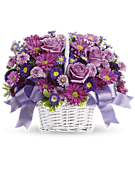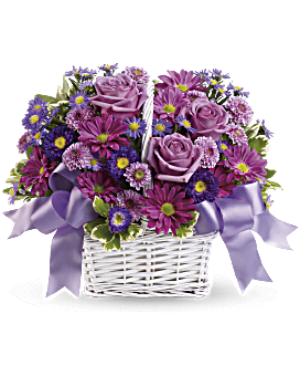 Get a handle on spring with this delightful array of floral favorites in a charming white bamboo basket accented with lavender ribbon. Surprise someone who could use a lift. It will make you both happy.