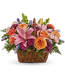 This bouquet features orange roses, light pink spray roses, pink asiatic lilies, burgundy carnations, orange carnations, bells of Ireland, purple cushion spray chrysanthemums, blue sinuata statice, variegated pittosporum and leatherleaf fern. Delivered in a Rectangular Basket with Handle.
