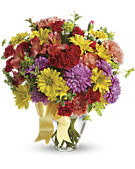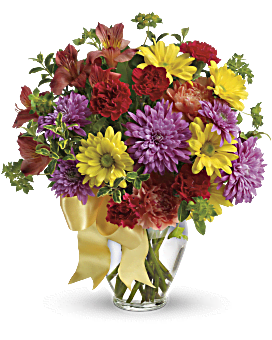 • Red alstroemeria, orange carnations, miniature red carnations, yellow daisies and lavender chrysanthemums are arranged with bupleurum and oregonia - with a pretty yellow ribbon tied around the vase for that extra-special touch. Delivered in a classic ginger vase.