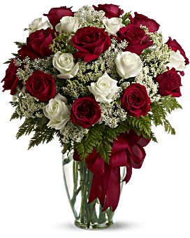 Love's divine, and roses are too. At almost two feet tall, this beautiful mix of red and white roses - accented with Queen Anne's Lace, and adorned with a bold red ribbon - is a timeless gift for your beloved.