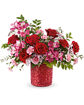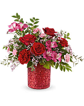 Teleflora's Be Dazzled Bouquet features red roses, red carnations, pink alstroemeria, miniature pink carnations, and pink limonium, accented with huckleberry, parvifolia eucalyptus, and leatherleaf fern. Presented in Teleflora's Magical Wish Cylinder, a red sparkle vase.