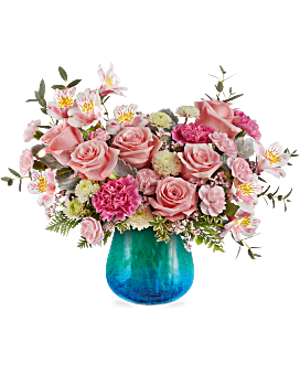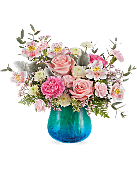 Soft and serene, Teleflora's Blue Hues Bouquet delights with blush pink blooms and airy whites, artistically arranged in a translucent turquoise glass vase with a crackled finish and dreamy gradient. A beautiful way to share calm and joy.