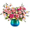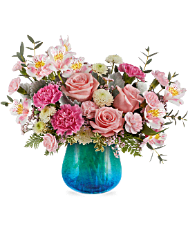 Teleflora's Blue Hues Bouquet features pink roses, pink alstroemeria, pink carnations, miniature pink carnations, white button spray chrysanthemums, pink limonium, dusty miller, parvifolia eucalyptus, leatherleaf fern, and oregonia, presented in Teleflora's Blue Hues Vase, a translucent glass vase with a turquoise gradient and crackled design.