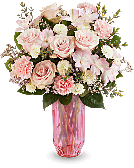 Teleflora's Chérie Bloom Bouquet features light pink roses, pink alstroemeria, pink carnations, white button spray chrysanthemums, pink limonium, parvifolia eucalyptus, and lemon leaf in Teleflora's Gorgeous Gem Vase.