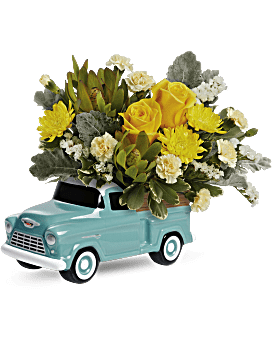 Yellow roses, miniature yellow carnations, yellow cushion spray chrysanthemums, white sinuata statice and green leucadendron are arranged with dusty miller and variegated pittosporum. Delivered in Teleflora's Chevy Pickup Keepsake.