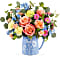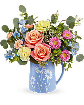 Brimming with fresh-picked charm, Teleflora's Daisy Dreams Bouquet delights with peach roses, yellow carnations, and cheerful blooms arranged in a food-safe blue pitcher adorned with a sweet white daisy design.