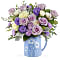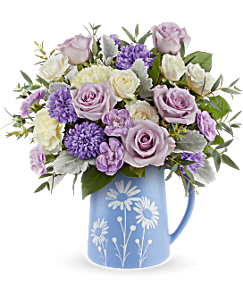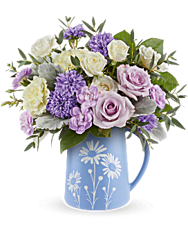 Soft and whimsical, Teleflora's Daisy Haze Bouquet captures pastel perfection with lavender roses, yellow carnations, and crème spray roses arranged in a blue food-safe pitcher adorned with a charming white daisy design.