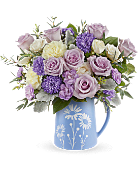 Teleflora's Daisy Haze Bouquet features lavender roses, crème spray roses, light yellow carnations, lavender miniature carnations, lavender Matsumoto asters, dusty miller, parvifolia eucalyptus, and lemon leaf, arranged in Teleflora's Daisy Dreams Pitcher, which meets FDA-approved to safely serve and store food.