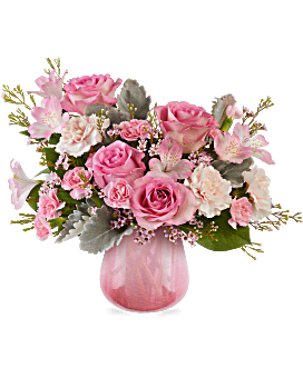 Sweet as can be, Teleflora's Darling Bloom Bouquet captures the soft side of love with pink roses, carnations, and alstroemeria arranged in a translucent crackled glass vase that fades into a lovely pink gradient-perfect for Valentine's Day.