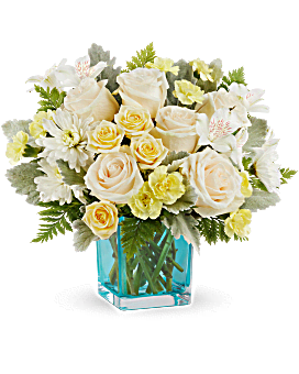 This stunning arrangement showcases crème roses, white alstroemeria, light yellow miniature carnations, white cushion spray chrysanthemums, dusty miller, and leatherleaf fern. Delivered in Teleflora's Turquoise Cube, designed to double as a charming votive.