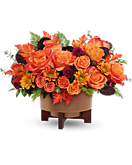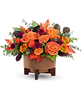 Teleflora's Fall For Copper Centerpiece is arranged in Teleflora's Modern Copper Planter with wooden stand. It features orange roses, orange spray roses, bronze daisy spray chrysanthemums, and purple button spray chrysanthemums. Accents include cotinus, spiral eucalyptus, huckleberry, and leatherleaf fern