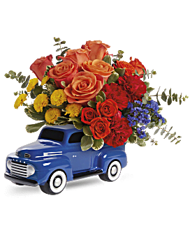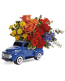 This bouquet includes orange roses, red carnations, yellow button spray chrysanthemums, blue sinuata statice, spiral eucalyptus and variegated pittosporum. Teleflora's Ford Vintage Truck Bouquet is delivered in Teleflora's '48 Ford Pickup Keepsake.