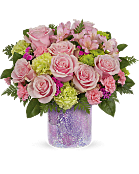 Celebrate mom's sparkle with a gift that shines! This charming pink and green bouquet in a glamorous mosaic glass vase will take her breath away.