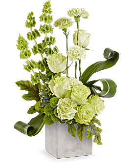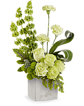 Teleflora's Garden Symphony Bouquet features green roses, bells of Ireland, green carnations, green button spray chrysanthemums, variegated aspidistra leaves, scented geranium leaves, and variegated pittosporum. Presented in the Modern Paradise Cube, a sleek concrete-inspired planter that complements any décor.