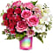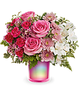 Bursting with color and charm, Teleflora's Gemstone Radiance Bouquet glows with pink and white blooms, artfully arranged in a dazzling iridescent fuchsia glass vase that adds a touch of modern magic to any moment.