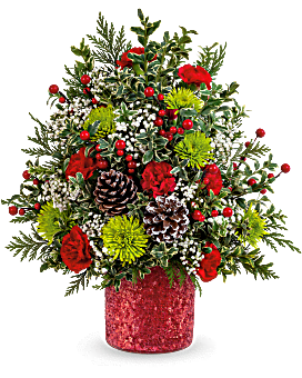 Teleflora's Holiday Cheer Tree includes red miniature carnations, green cushion spray chrysanthemums, gypsophila, oregonia, and cedar. Arranged with pinecones and berries in Teleflora's Magical Wish Vase