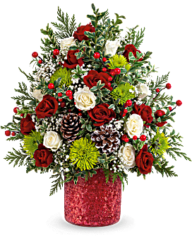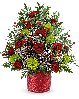 Teleflora's Holiday Cheer Tree is brimming with joy! Red carnations, green mums, and winter accents are hand-arranged in Teleflora's sparkling Magical Wish Vase. This floral Christmas tree is a playful and festive gift for any holiday celebration.