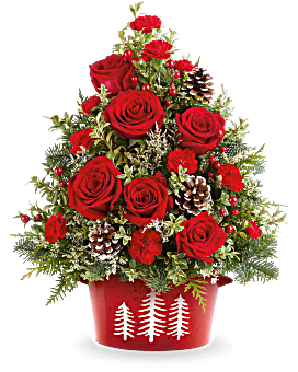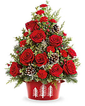 Bring holiday cheer home with Teleflora's Holiday Traditions Tree. This festive floral tree of red roses, holiday greens, and pinecones is hand-arranged in Teleflora's Snowy Pines Dish-perfect for tabletops or holiday gifting.