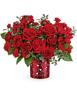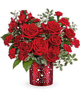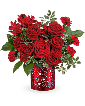 Let your love shine with Teleflora's I Heart You Bouquet, featuring a passionate mix of red roses, alstroemeria, and carnations arranged in a red metal lantern adorned with charming heart and dot cutouts-a heartfelt Valentine's Day keepsake.