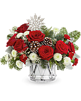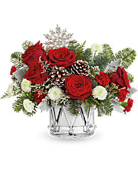 Teleflora's Little Drummer Joy Bouquet marches in the holiday cheer with red roses, wintery greens, and festive white blooms in Teleflora's keepsake Crystal Drum Vase. A joyful gift for any Christmas celebration.