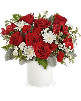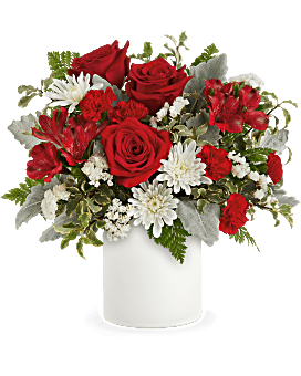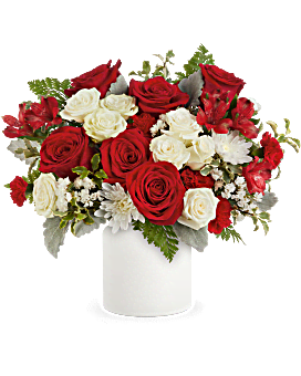 Teleflora's Lush Love Bouquet includes red roses, red alstroemeria, miniature red carnations, white cushion spray chrysanthemums, and white statice, accented with dusty miller, leatherleaf fern, and pitta negra. Designed in a white frosted Savannah jar.
