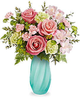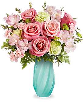 Soft and refreshing, Teleflora's Meadow Mist Bouquet captures the gentle beauty of blooming fields with coral roses, pink alstroemeria, and green carnations in a sculpted glass vase with graceful diagonal swirls.