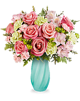 Teleflora's Meadow Mist Bouquet features coral roses, pink alstroemeria, green carnations, pink miniature carnations, bupleurum, parvifolia eucalyptus, and leatherleaf fern, arranged in Teleflora's Blue Radiance Vase, a sculpted glass vase with a diagonal swirl pattern.