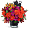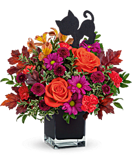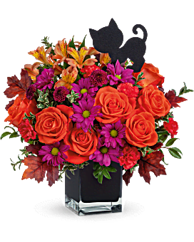 Teleflora's Midnight Magic casts Halloween charm with orange roses, bold fall blooms, and a playful black cat pick in a sleek black glass cube. A bewitching floral treat for parties or seasonal gifting!