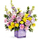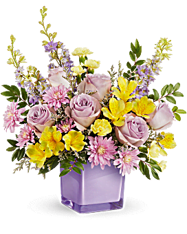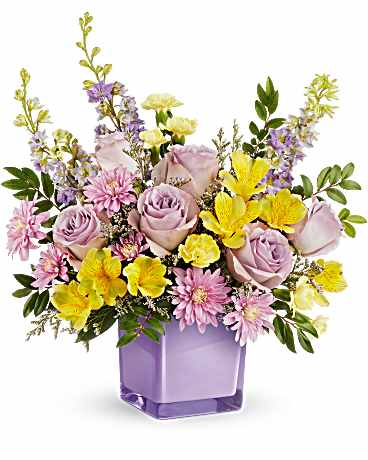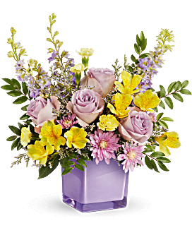 Bring a soft touch of spring indoors with Teleflora's Pastel Paradise Bouquet. Lavender roses and golden blooms shine in a radiant purple glass cube, creating a fresh, joyful display of color and beauty.