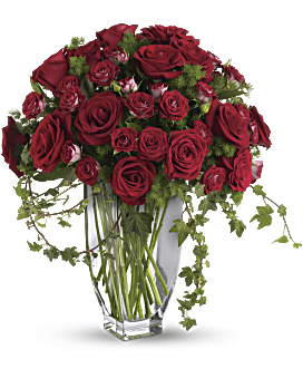 As touching as it is elegant, this full bouquet of classic red roses is gently set in a graceful glass vase to comfort loved ones and celebrate sweet remembrance.