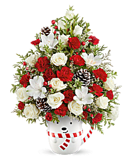Teleflora's Send A Hug® Snowy Lane Tree is a festive floral Christmas tree bursting with white alstroemeria, red blooms, and winter greens. Arranged in Teleflora's Cozy Cub Wish Mug, it's a cheerful holiday surprise.