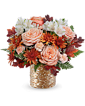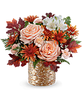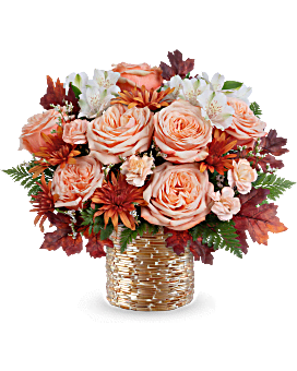 Sparkling Blooms Bouquet includes peach roses, white alstroemeria, peach miniature carnations, bronze cushion spray chrysanthemums, white limonium, leatherleaf fern, and preserved oak leaves in a golden mosaic vase.