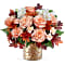 Sparkling Blooms Bouquet bursts with fall color and texture. Peach roses and autumn blooms are arranged in a shimmering mosaic vase-ideal for Thanksgiving, fall birthdays, or seasonal centerpieces.