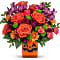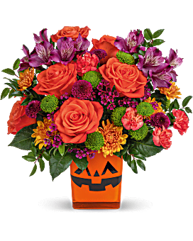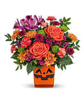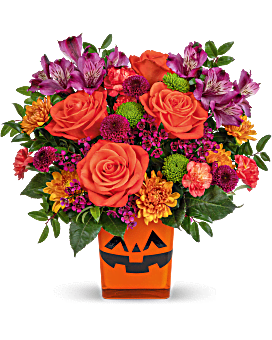Teleflora's Spooky Spectacle Bouquet is a Halloween treat! Bright orange roses, colorful mums, and a fun jack-o'-lantern face light up Teleflora's Coral Color Splash Cube. A cheerful pumpkin-themed gift for spooky celebrations.