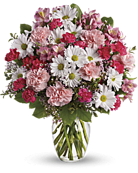 - The magnificent bouquet includes pink alstroemeria, pink carnations, hot pink miniature carnations, white daisy spray chrysanthemums and white waxflower, accented with assorted greenery.
