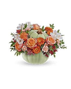 Teleflora's Whimsy Pumpkin Bouquet offers a stylish option for your autumn table. This sophisticated arrangement of fall roses comes in a beautiful ceramic pumpkin adorned with intricate hand-painted accents in sage green.