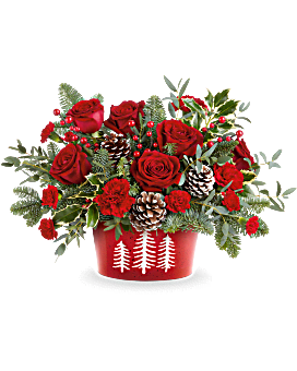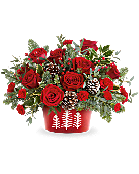 Teleflora's Winter Whimsy Centerpiece brings festive cheer to your table. Red roses, rich evergreens, and frosted pinecones are beautifully arranged in Teleflora's Snowy Pines Dish-perfect for Christmas or winter gatherings.
