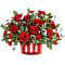 Teleflora's Winter Whimsy Centerpiece includes red roses, red carnations, and red miniature carnations. Accented with parvifolia eucalyptus, variegated holly, noble fir, and frosted pinecones in Teleflora's Snowy Pines Dish