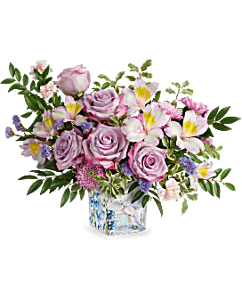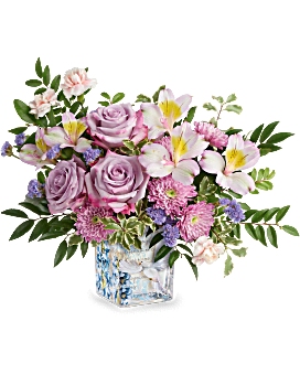 Peaceful and poetic, Teleflora's Written In The Sky Bouquet inspires serenity with lavender roses and soft pastel blooms arranged in a glass cube adorned with delicate flowers and a graceful dove design.