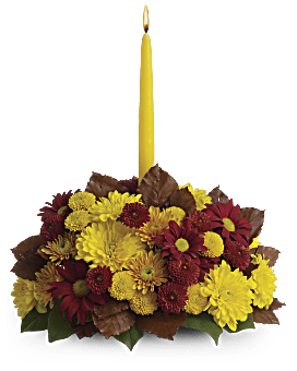 Happy yellow mums and a golden taper candle bring sunshine to your Thanksgiving dinner table. Lovely as a Thanksgiving centerpiece or stylish seasonal décor anywhere in the house, the burgundy and yellow fall flowers look especially rich mixed with brown copper beech leaves.