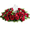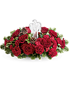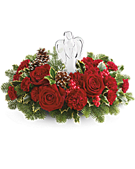 Teleflora's Evergreen Blooms Bouquet includes red roses, red carnations, and red miniature carnations. Accented with noble fir and variegated holly, all arranged with a keepsake Crystal Angel