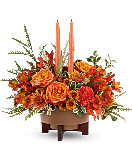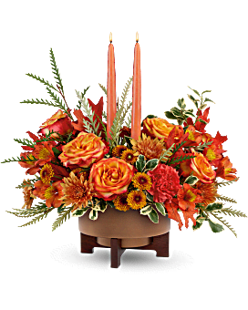 Warm hearts and tables with Teleflora's Fall Harvest Centerpiece. Featuring two elegant taper candles and a rich mix of orange blooms, this stunning arrangement shines in Teleflora's Modern Copper Planter. A perfect fit for Thanksgiving or any occasion this autumn