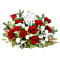 Teleflora's Joy to the World Bouquet features red roses, white miniature carnations, and white button spray chrysanthemums. Accented with dusty miller, seeded eucalyptus, oregonia, cedar, Douglas fir, and white pine in Teleflora's Crystal Angel
