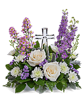 This beautiful piece includes crème roses, lavender larkspur, lavender montecasino asters, white cushion spray chrysanthemums, lavender sinuata statice, lemon leaf and dusty miller. Delivered with Teleflora's Small Crystal Cross.