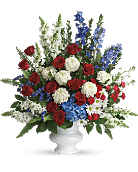 This bold display in a classic white urn - including flowers such as red roses and carnations, white stock, snapdragons and chrysanthemums, blue hydrangea and delphinium - appropriately honors the beloved veteran or patriot.