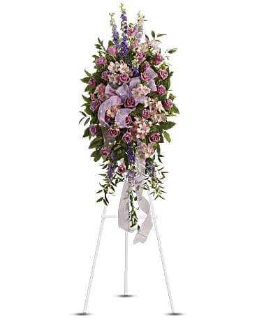 This abundant spray of soft, feminine spring colors feels as calming as a walk in the countryside. Sheer organza ribbon is threaded through lavender, purple and pink blooms that are accented by trailing greens.