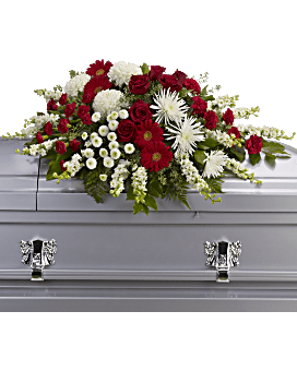 This lovely mix of flowers such as red roses, gerberas and carnations is balanced by white chrysanthemums and larkspur set against an assortment of greens including eucalyptus, salal, and leatherleaf fern to create a strikingly beautiful casket spray.