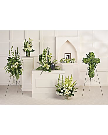 Teleflora's Tranquil Peace Collection includes the following six sympathy set pieces: Tranquil Peace Cremation Tribute, Forever At Peace Spray, Garden Cross, Teleflora's Clouds Of Heaven Bouquet DX, Garden Wreath Photo Tribute DX, Botanical Beauty Bouquet DX