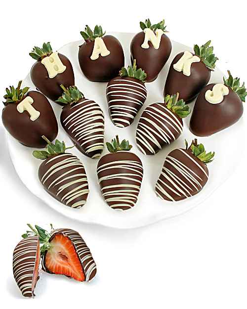 Our Berry-Gram? is a unique and delicious way to say Thank You! Perfectly ripe, juicy strawberries are hand-dipped in rich, sinful dark Belgian chocolate and beautifully decorated with white chocolate lettering spelling out ?Thanks,? finished with an elegant dark chocolate drizzle. Simply irresistible!